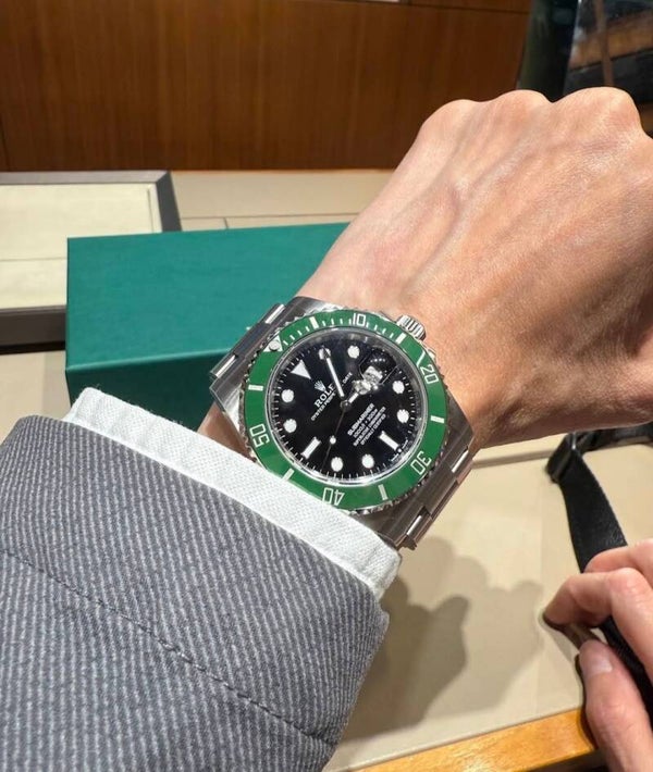 Reloj Rolex Submariner Date 126610LV “Kermit”, en excelente estado. Caja de acero Oystersteel de 41 mm, bisel cerámico verde, esfera negra y brazalete Oyster con cierre Glidelock. Movimiento automático calibre 3235 con 70 h de reserva de marcha. Hermético hasta 300 m. Icono de la relojería deportiva de lujo, muy buscado por coleccionistas. Con caja y papeles originales.
