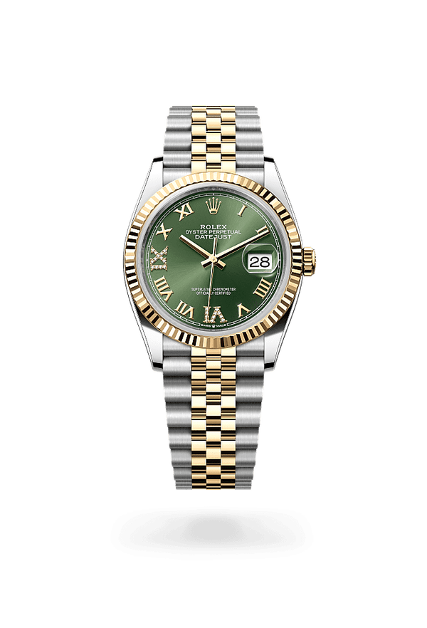 Elegancia clásica con un toque moderno. Este icónico Rolex Datejust combina acero inoxidable y oro amarillo de 18 quilates en una pulsera Jubilee, con un bisel acanalado que refleja la luz con distinción. Su esfera verde oliva presenta números romanos dorados y el “IX” engastado con diamantes, símbolo de sofisticación. Equipado con el calibre automático 3235, ofrece precisión, fiabilidad y una reserva de marcha de 70 horas.